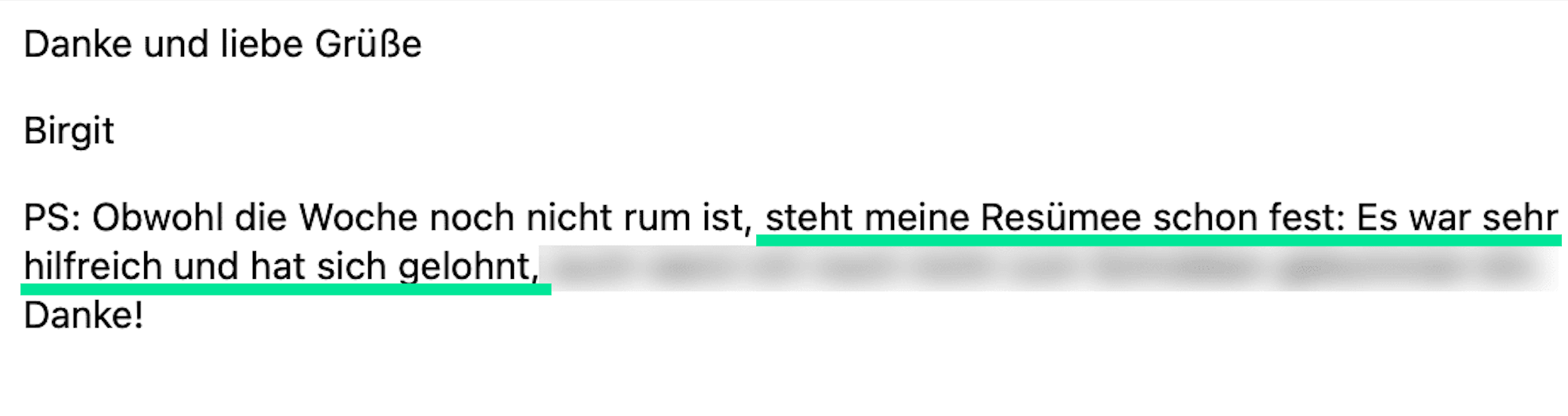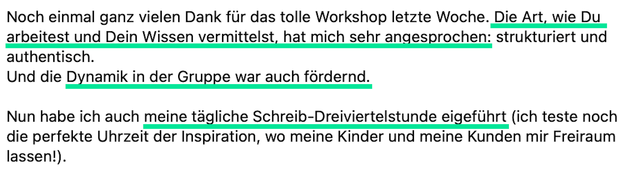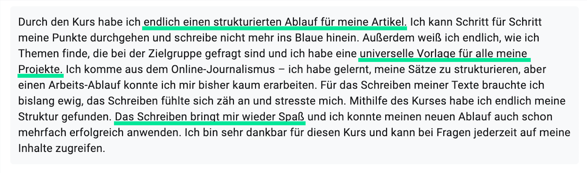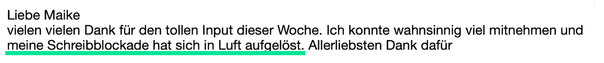 Mein größter Mehrwert: Ich weiss nun ganz genau wie ich vorgehen kann und ich bin sowohl vor, während und nach dem Schreiben nicht mehr überfordert. Dank den Unterlagen kann ich immer wieder überprüfen, ob ich vom Weg abkomme. Obwohl Maike vieles auf ihrem Blog preisgibt, würde ich die Schreibhelden jedem empfehlen der seine Blogbeiträge auf den Punkt bringen will und diesen dann auch noch ideal für die Zielgruppe aufbereiten möchte (und ganz nebenbei in Google dafür gefunden werden möchte).