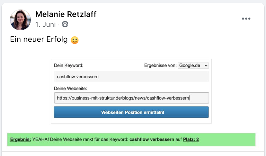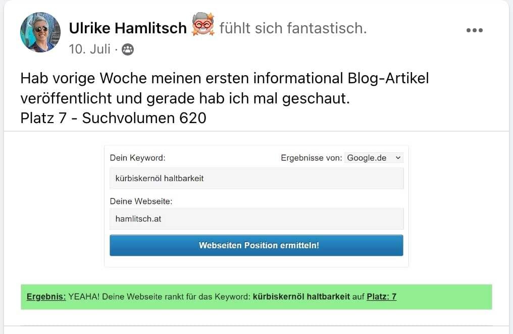 Nachdem ich meine Blogbeiträge nach der Satzgestalt-Methode optimiert hatte, wurden sie häufiger gefunden und einige meiner Beiträge zu Rheuma sind inzwischen auf Seite 1 bei Google. Die Reichweite wächst stetig 😊